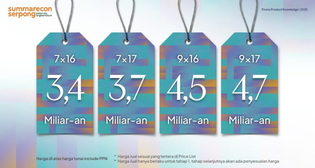 Finore Summarecon Serpong – Luxury Within Reach Post author:adminpp Post published:November 6, 2025 Post category:Residential / Summarecon Serpong Post comments:0 Comments Finore Summarecon Serpong, from Finland to Serpong.Terinspirasi dari Finnish Style Design yang modern, simplistic dan mewah, Summarecon Serpong menghadirkan Finore di penghujung tahun 2025.Hadir dalam 4 type unit Rumah, Finore dipasarkan mulai harga Rp. 3,4 Miliar saja. Luxury in SimplicityDesign Finore mengadaptasi gaya design dari Finland dan Scandinavian yang simple dan fokus pada fungsi serta practicality.Penggunaan material-nya banyak menggunakan unsur nature seperti kayu, batu, dipadukan dengan elemen modern seperti steel dan glass.Garis-garis tegas tanpa banyak ornamen menegaskan ciri design modern Finore.Bukaan jendela besar dengan tinggi hingga 2,4 meter bisa dijumpai di seluruh sudut rumah, untuk memaksimalkan natural light. The Heart of the CityFinore berada di sentra Gading Serpong, dimana penghuni mendapatkan kemudahan dari seluruh kelengkapan dari mega fasilitas yang ada.Mulai dari pusat bisnis, shopping centre, edukasi, rumah sakit hingga entertainment dan wellness hanya selangkah dari Finore. Crafted for ComfortPenghuni Finore bisa merasakan kenyamanan fasilitas ala fancy resort di Clubhouse yang ada.Arsitek yang merancang resort bintang lima Movenpick, Jimbaran Bali turut mendesign Clubhouse dari Finore.Selain itu, design rumah dari Finore sudah dilengkapi dengan full smarthome-system, serta sanitary Kohler automatic untuk kenyamanan maksimal. The AurorasFinore available dalam 4 type utama yaitu:-Aurora A dengan dimensi 9 x 17-Aurora B dengan dimensi 9 x 16-Aurora C dengan dimensi 7 x 17-Aurora D dengan dimensi 7 x 16Keempat type tersebut juga hadir dalam variasi bangunan yang bisa dipilih :–Premium : Kamar Tidur 4+1 dan Kamar Mandi 4+1–Deluxe : Kamar Tidur 3+1 dan kamar Mandi 4+1 MORE INFO0811 999 398 Tags: finore, gading serpong, rumah, summarecon serpong Read more articles Previous PostAltadena Residences : Rumah Mewah Modern Klasik di jantung Gading Serpong You Might Also Like Laurel at NAVA Park January 3, 2023 Cluster Chava Tanakayu BSD City October 3, 2022 Citra Garden Bintaro luncurkan Cluster Perdana mulai 1 Milyar October 5, 2023 Leave a Reply Cancel replyCommentEnter your name or username to comment Enter your email address to comment Enter your website URL (optional) Save my name, email, and website in this browser for the next time I comment. Δ